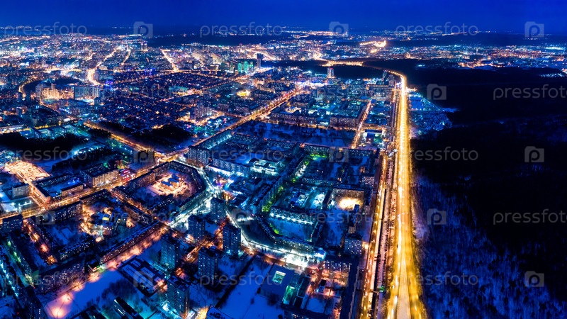 Екатеринбург, Россия. Панорама ночной городской авиации. Уличные фонари, освещенные фонарями
