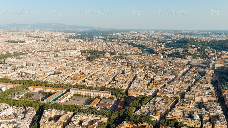 Рим, Италия. Общая панорама города. Административные здания в центре города. Вечернее время, вид с воздуха