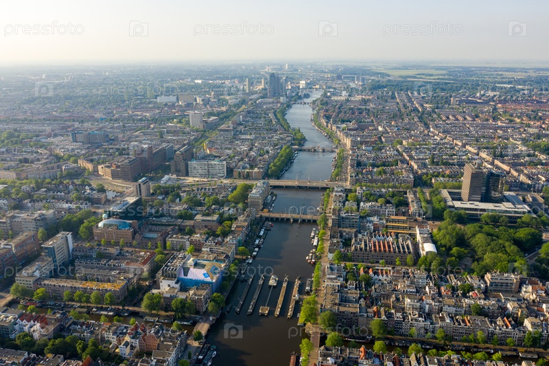 Амстердам, Нидерланды. Панорама города с воздуха. Река Амстел и ворота. Лето