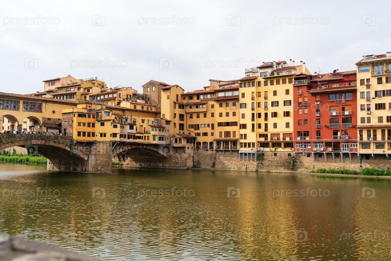 Флоренция, Италия. Понте Веккьо - средневековый арочный мост с сувенирными и ювелирными магазинами. Летний день