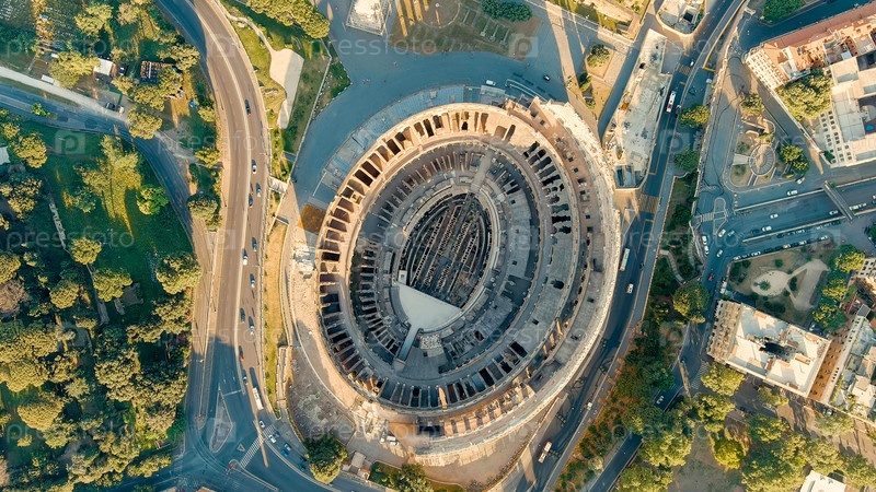 Рим, Италия. Руины Древнего Рима. Полет над городом. Панорама города утром. Лето, вид с воздуха