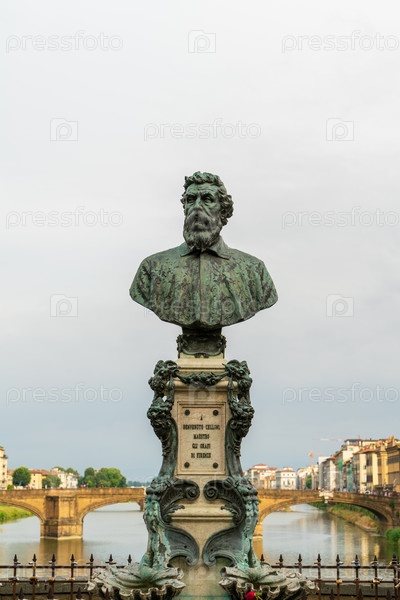 Флоренция, Италия. Фонтанный памятник Челлини на Старом мосту. Открыт в 1902 году скульптором Рафаэлло Романелли (1856-1928). Надписи на постаменте: Бенвенуто Челлини. учителю. ювелиры Флоренции