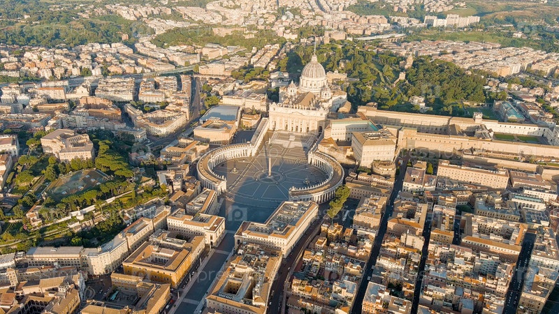 Рим, Италия. Вид на Ватикан. Базилика Сан Пьетро, площадь Сан Пьетро. Полет над городом. Утренние часы, вид с воздуха