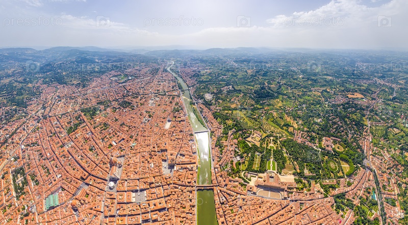 Флоренция, Италия. Общий вид на город в солнечный день. Река Арно. Вид с воздуха