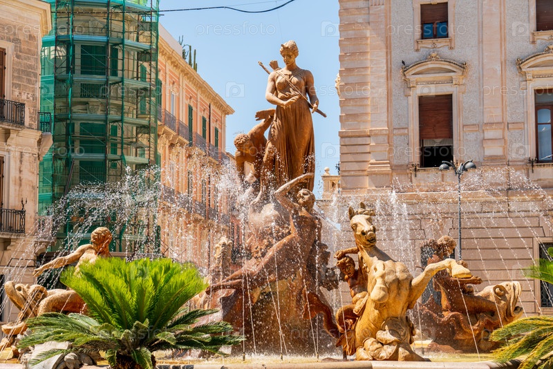 Сиракузы, Сицилия, Италия. Фонтан Дианы — классический фонтан со статуей богини охоты Дианы, созданный в 1907 году скульптором Джулио Мошетти. Солнечный летний день