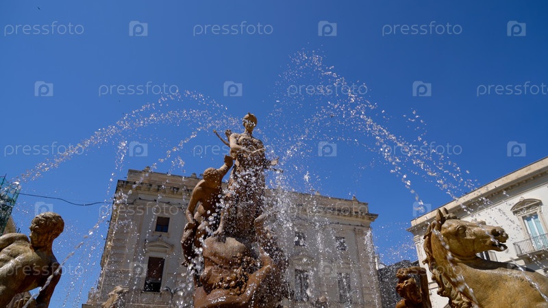 Сиракузы, Сицилия, Италия. Фонтан Дианы — классический фонтан со статуей богини охоты Дианы, созданный в 1907 году скульптором Джулио Мошетти. Солнечный летний день