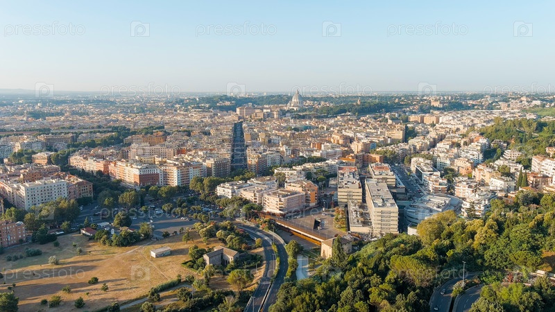 Рим, Италия. Вид на Ватикан. Купол базилики Сан-Пьетро, Полет над городом. Утренние часы, вид с воздуха