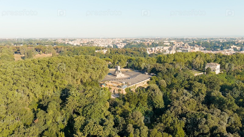 Рим, Италия. Памятник Джузеппе Гарибальди. Яникул, один из холмов Рима. Лето. Утренние часы, вид с воздуха