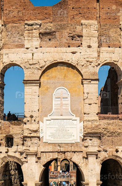 Рим, Италия. Вне Колизея - на востоке, большая мраморная доска, висевшая над входом в Колизей, сообщает, что «реставрация» была завершена при папе Пию IX в 1852 году