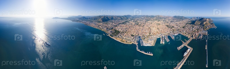 Палермо, Сицилия, Италия. Городской порт с кораблями и круизными судами. Солнечный летний день. Панорама 360. Вид с воздуха