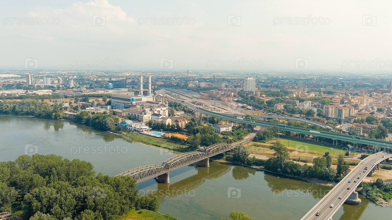 Пьяченца, Италия. Рейс из города. Шоссе и промышленная зона. По Ривер. Летний день, Aerial View