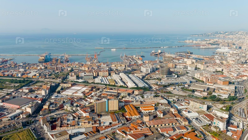 Неаполь, Италия. Панорама города с видом на порт и железнодорожный вокзал. Дневной вид с воздуха
