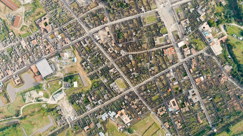 Помпеи, Италия. Помпеи — крупный древнеримский город, ныне крупный археологический комплекс. Общий вид сверху, вид с воздуха