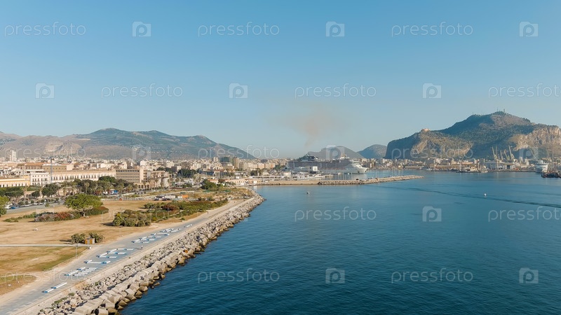 Палермо, Сицилия, Италия. Большое круизное судно пришвартовано в порту Палермо. Много дыма из дымохода. Палермо является столицей итальянского острова Сицилия, вид с воздуха