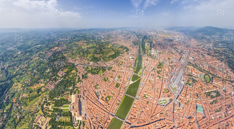 Флоренция, Италия. Общий вид на город в солнечный день. Река Арно. Вид с воздуха