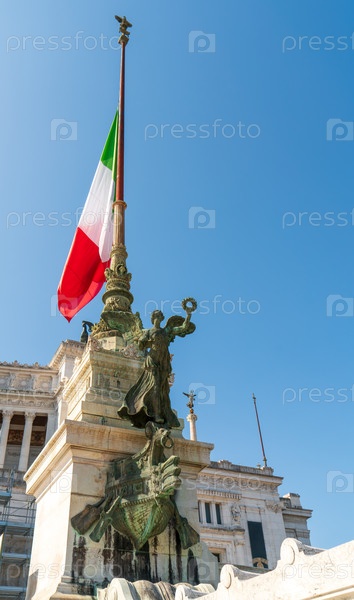 Рим, Италия. Флагшток с флагом. Витториано - памятник в честь первого короля объединенной Италии Виктора Эммануила II