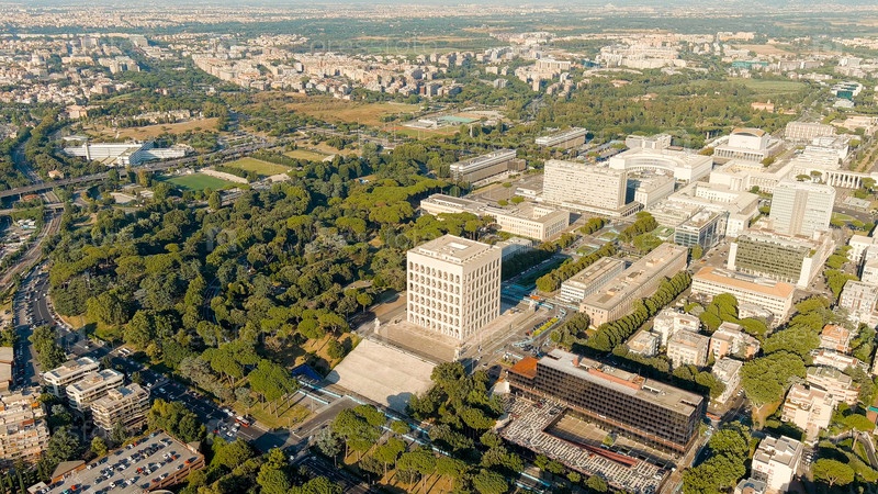 Рим, Италия. Колизей Квадранта. Панорамный вид. Район EUR - Quarter представляет собой обширный комплекс зданий, построенных по приказу диктатора Бенито Муссолини