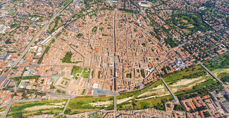 Парма, Италия. Исторический центр. Панорама города в летний день. Солнечная погода. Вид с воздуха