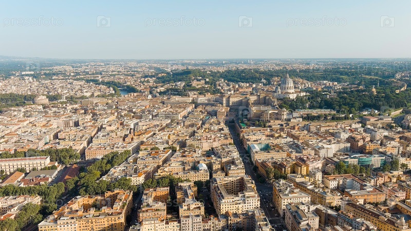Рим, Италия. Вид на Ватикан. Купол базилики Сан-Пьетро, Полет над городом. Вечернее время, вид с воздуха
