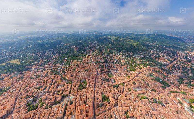 Болонья, Италия. Исторический центр. Панорама города в летний день. Солнечная погода. Вид с воздуха