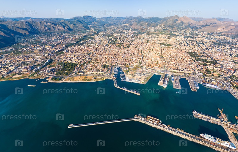 Палермо, Сицилия, Италия. Городской порт с кораблями и круизными судами. Солнечный летний день. Вид с воздуха