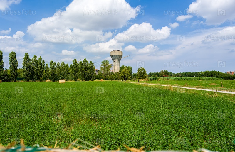Модена, Италия. Городской парк - Parco Comunale del Tricolore Italiano. Старая башня. Летний день. Солнечная погода