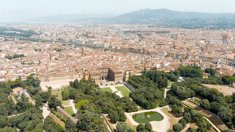 Флоренция, Италия. Палаццо Питти — Королевский дворец эпохи Возрождения. Сады Боболи (Giardino di Boboli) - классический сад 16-17 веков. Лето, вид с воздуха