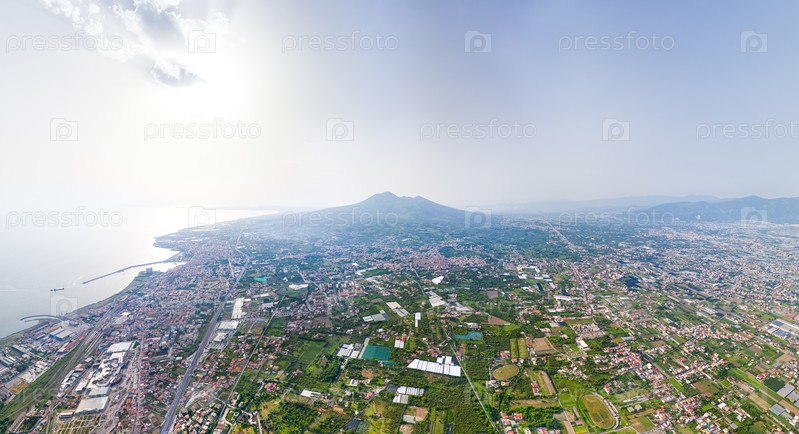 Помпеи, Неаполь, Италия. Руины древнего города. Вид на вулкан Визувий, город и море. Летом, днем. Вид с воздуха