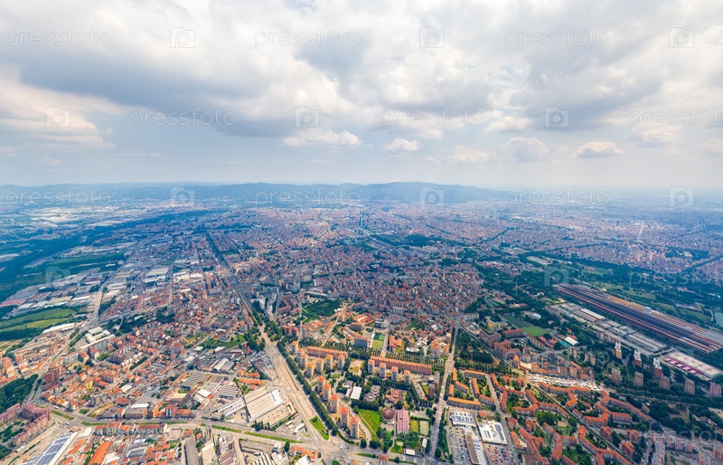 Турин, Италия. Панорама города летом. Промышленные и жилые районы. Филдс. Вид с воздуха