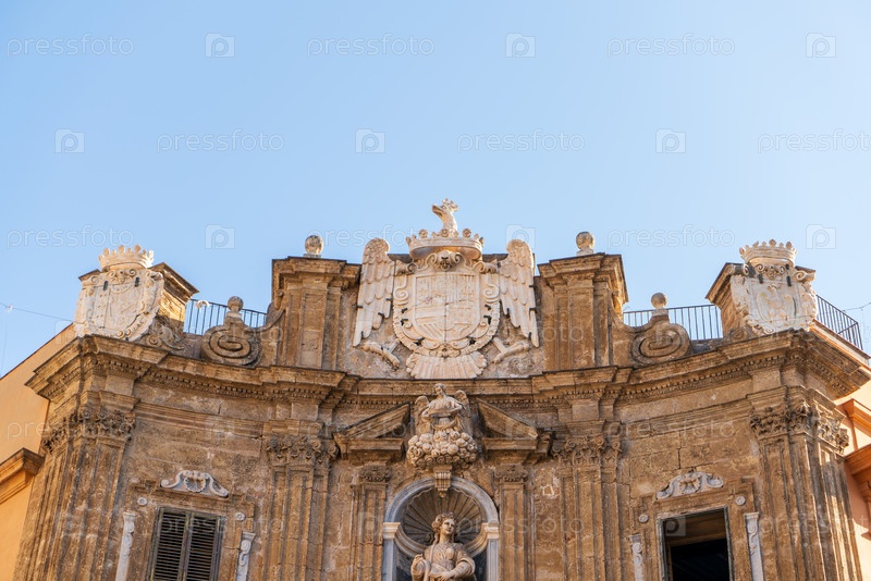 Палермо, Сицилия, Италия. Фасад на площади Quattro Canti в Палермо. Солнечный летний день