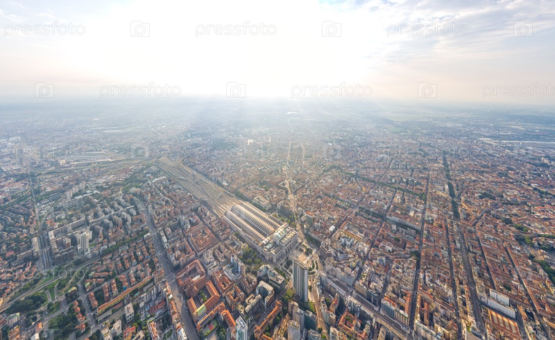Милан, Италия. Панорама центральной части города. Летний день с облаками. Вид с воздуха