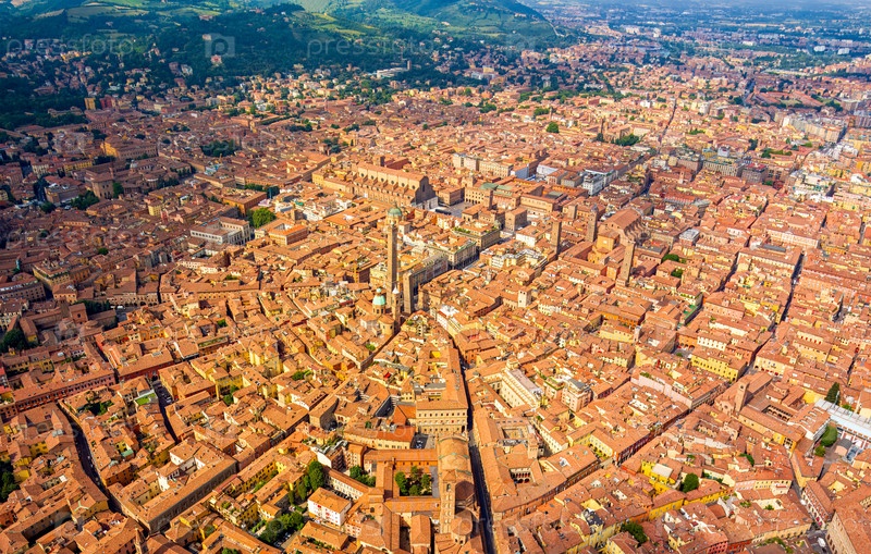 Болонья, Италия. Башни 12-го века с видом на город, построенные благородными итальянскими семьями. Символ Болоньи. Панорама города в летний день. Солнечная погода. Вид с воздуха