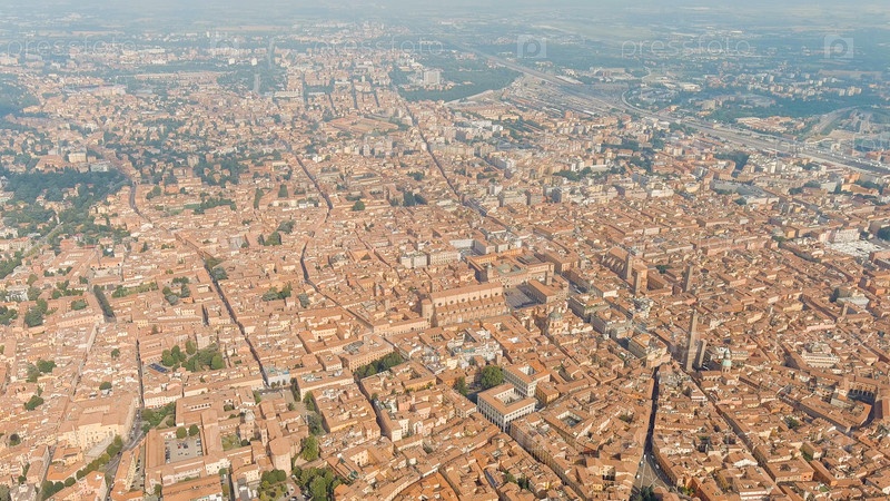 Болонья, Италия. Старый город. Панорамный вид на город. Лето, вид с воздуха