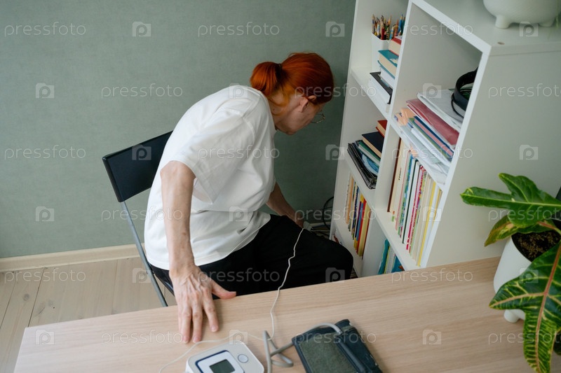 Пожилая женщина наклоняется назад, чтобы подключить провод питания своего монитора артериального давления к электрической розетке. Устройство лежит на столе