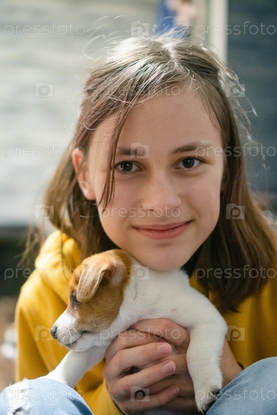 Подросток и ее щенок Джек Рассел терьер делят момент любви и привязанности. Девушка держит на руках маленькую собаку
