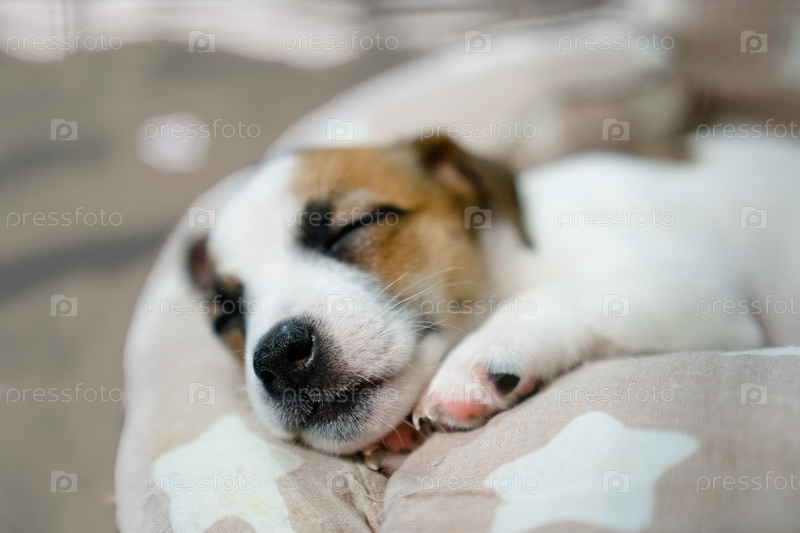Очаровательный спящий щенок, мирно мечтающий в уютной постели