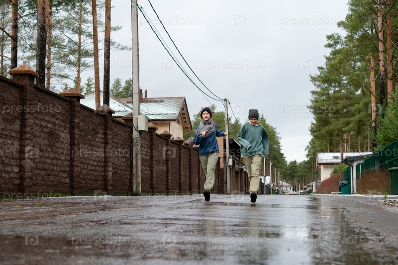 Низкоугольный выстрел с фронта захватывает девочку-подростка и мальчика, бегущего по мокрой улице. Определенные выражения подчеркивают энергию, повседневную физическую форму и преимущества активного спорта в любую погоду