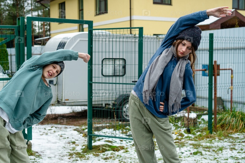 Девочка-подросток и мальчик выполняют боковые изгибы, чтобы разогреть туловище и основные мышцы перед бегом. Латеральные упражнения на гибкость являются частью полной разминки для спорта на открытом воздухе