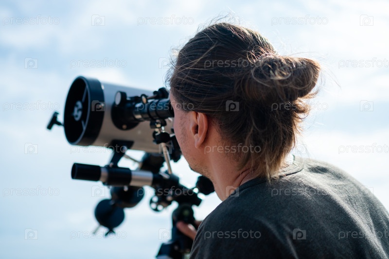 Задний вид крупным планом захватывает человека с помощью профессионального телескопа на фоне огромного голубого неба. Изображение подчеркивает высокое качество астрономического оборудования и безмятежную обстановку, отражающую глубокий интерес