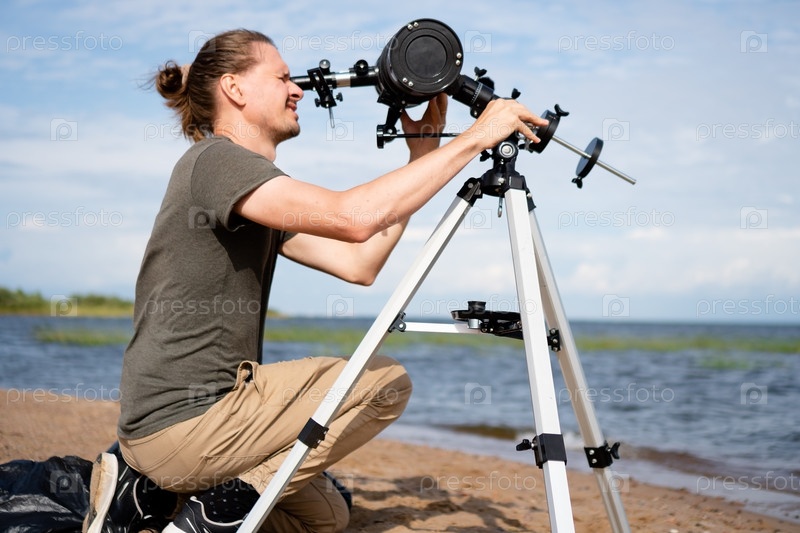 Мужчина установил телескоп на пляже для наблюдения за Солнцем