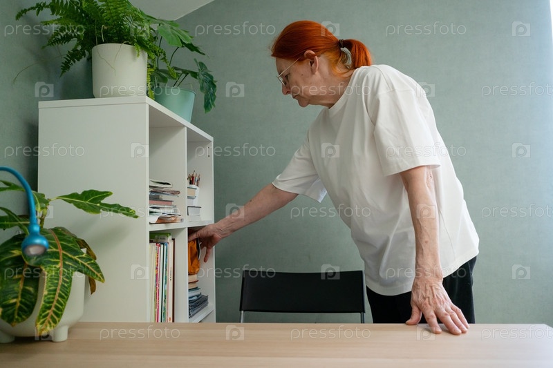 Пожилая женщина достает косметическую сумку с полки