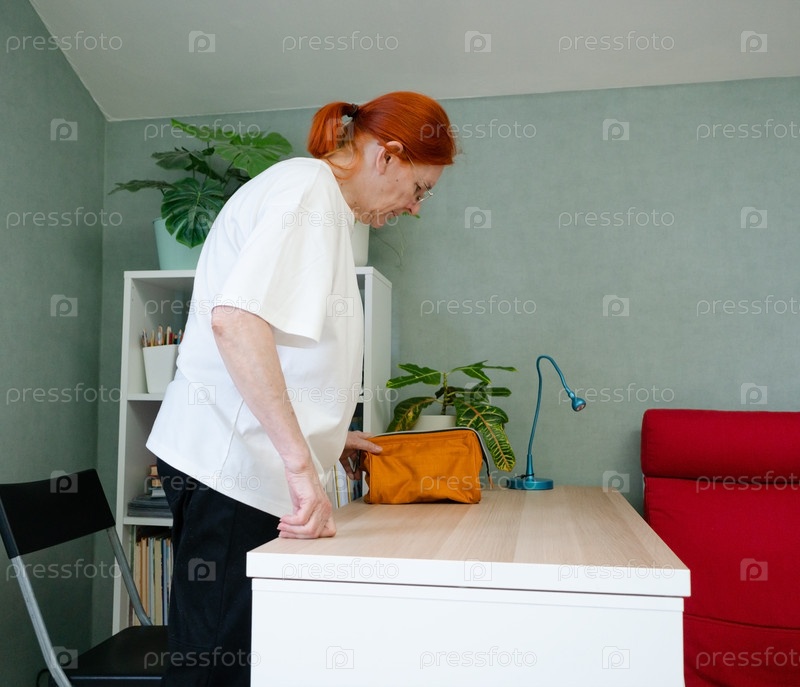 Семидесятилетняя женщина садится за стол, держа в руках небольшую косметическую сумку. Удобная и знакомая обстановка дома