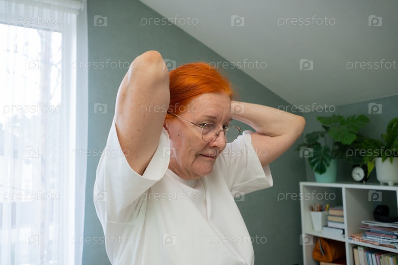 Пожилая женщина разминается с поднятыми руками