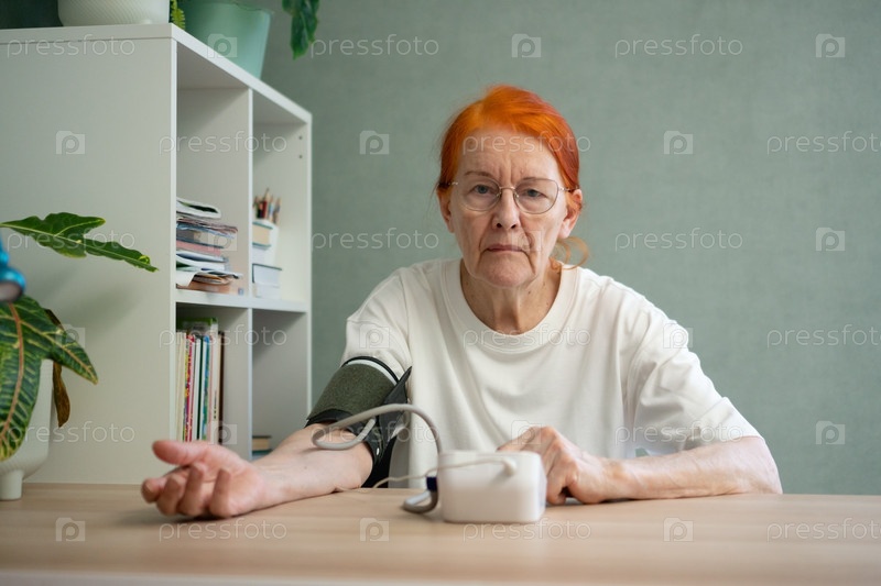 Пожилая женщина сидит за столом, направляя вопросительный и озадаченный взгляд прямо на камеру. момент неопределенности, возможно, связанный с проблемами со здоровьем или рутиной мониторинга ее артериального давления