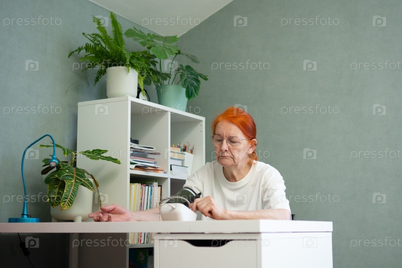 Пожилая женщина сидит за своим столом в домашней обстановке, терпеливо ожидая результата измерения артериального давления. рутинное ожидание и бдительность в отношении здоровья, распространенные в повседневной жизни пожилых людей