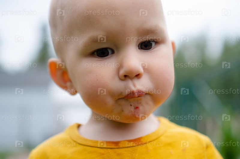 Восхитительно грязный малыш любит есть свежесобранную клубнику, лицо замазано соком. Простое удовольствие от сезонных ягод как от здоровых