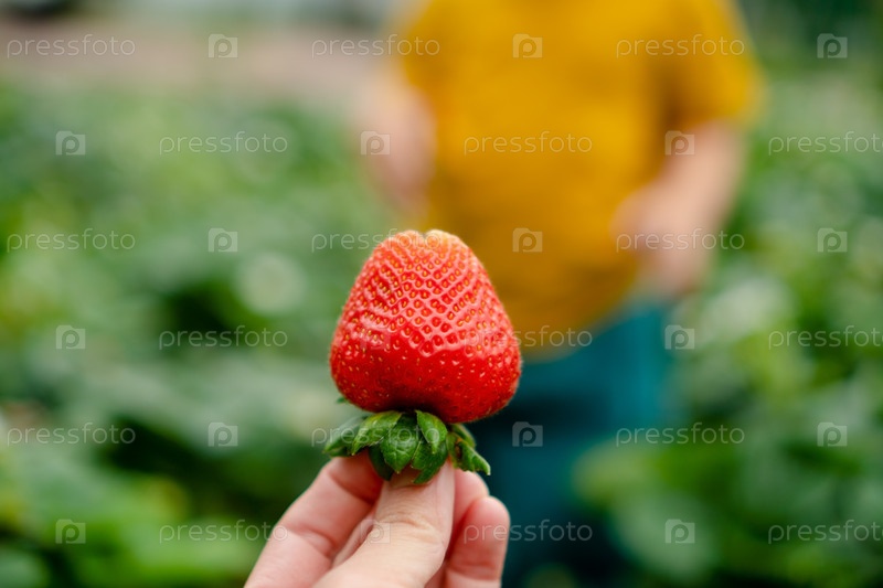 На переднем плане рука матери держит спелую красную клубнику. Маленький ребенок мягко размыт на заднем плане, создавая сцену о совместном использовании здоровой пищи