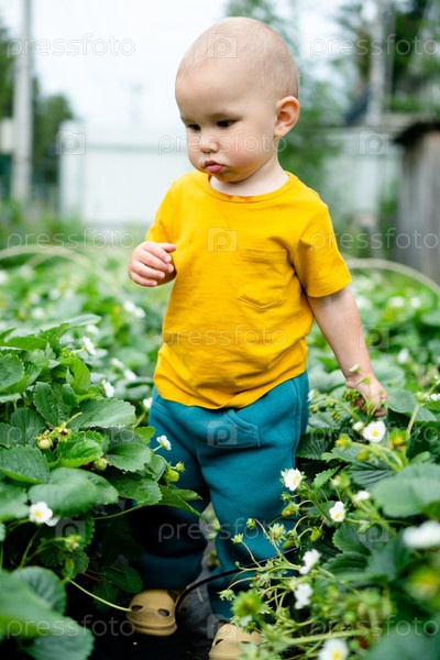 Маленький малыш стоит среди ярких клубничных кустарников, растущих в садовой кровати на открытом воздухе. момент летнего освоения и введения свежих сезонных ягод в детский рацион