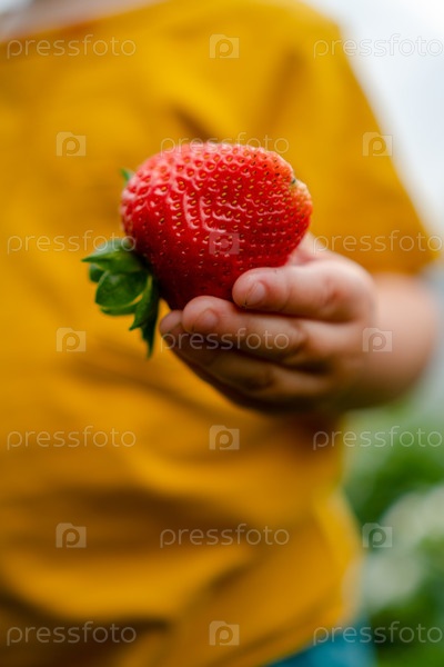 Крупный план показывает огромную, спелую клубнику, удерживаемую крошечной рукой ребенка, создавая поразительный контраст размера. Введение существенного, естественного питания в рацион маленького ребенка в течение лета