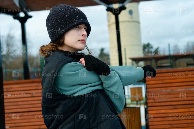 Женщина, растягивающая предплечья во время тренировки на открытом воздухе. Подчеркивая важность гибкости предплечья для общего физического здоровья и активности